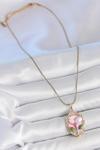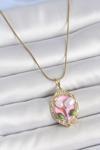 316L Çelik Gold Renk Zincir Pembe Mineli İncili Çiçek İşlemeli Portre Model Kadın Kolye