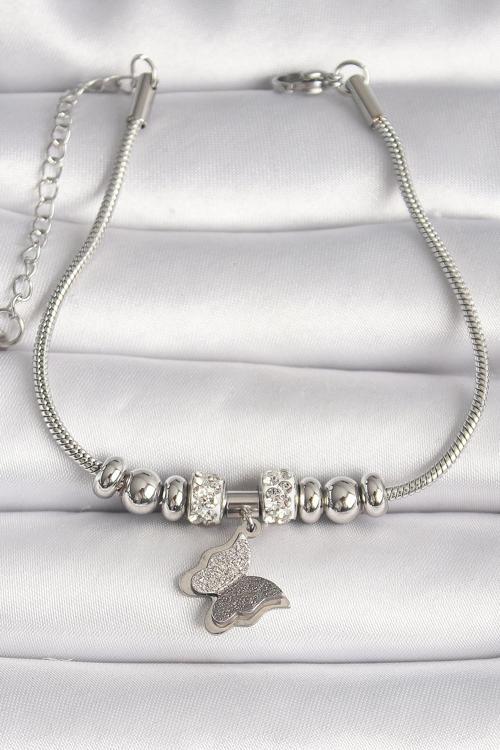 Skygo 316L Çelik Gümüş Renk Tüp Zincir Model Zirkon Taş Detaylı Sallantı Simli Kelebek Figür Kadın Bilekli