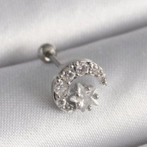 316L Çelik Gümüş Renk Zirkon Taşlı Ay Yıldız Tragus Piercing