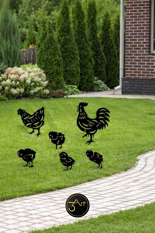 - Her biri 20-25 cm boyutunda olan bu dekoratif tavuk ailesi, bahçenizin atmosferini canlandırır.