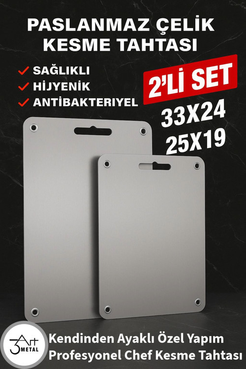 3Art Metal Paslanmaz Çelik Kesme Tahtası 2’Li Set - Hijyenik, Kokusuz Ve Antibakteriyel - Gömme Ayaklı