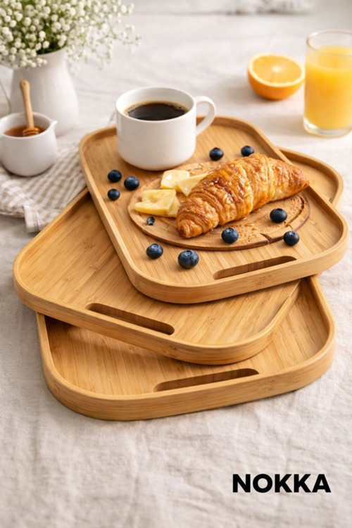 - Doğal bambu materyali sayesinde çevre dostu ve sürdürülebilir bir kullanım sunar.; - Üç farklı boyutta (33, 40 ve 46 cm) dikdörtgen tepsi seti, çeşitli sunum ihtiyaçlarınıza cevap verir.; - 46 x 30 cm ebatındaki büyük tepsi, geniş yüzeyiyle bol miktarda yiyeceği rahatça taşıyabilir.; - Elde yıkanabilir özelliği ile kolay temizlenebilir ve hijyenik bir kullanım sağlar.;