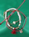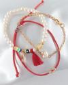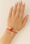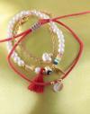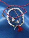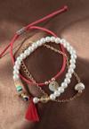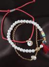 Keeba 3lü nazar boncuklu incili püsküllü asansörlü lastikli kırmızı ip bileklik. Kadın ip bileklik halhal