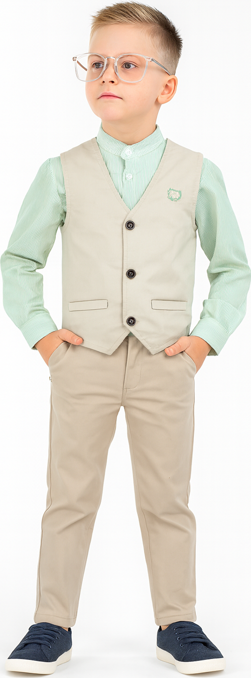 Pamuklu kumaştan üretilmiş bu özel set; çizgili gömlek, düğmeli yelek ve gabardin pantolondan oluşuyor. Yumuşak dokusu ve rahat kesimi sayesinde çocuğunuza gün boyu konfor sunarken, şık tasarımıyla özel günlerde de öne çıkar. Modern çizgileriyle hem rahat hem de stil sahibi bir görünüm sağlar.