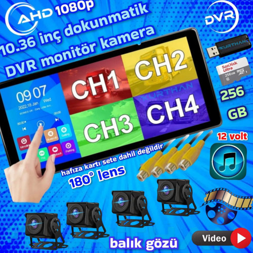 10,36 İNÇ IPS DOKUNMATİK 4K EKRAN YÜKSEK ÇÖZÜNÜRLÜK DVR MONİTÖR VE 1080P AHD 180 DERECE GENİŞ AÇILI KAMERA SETİ
