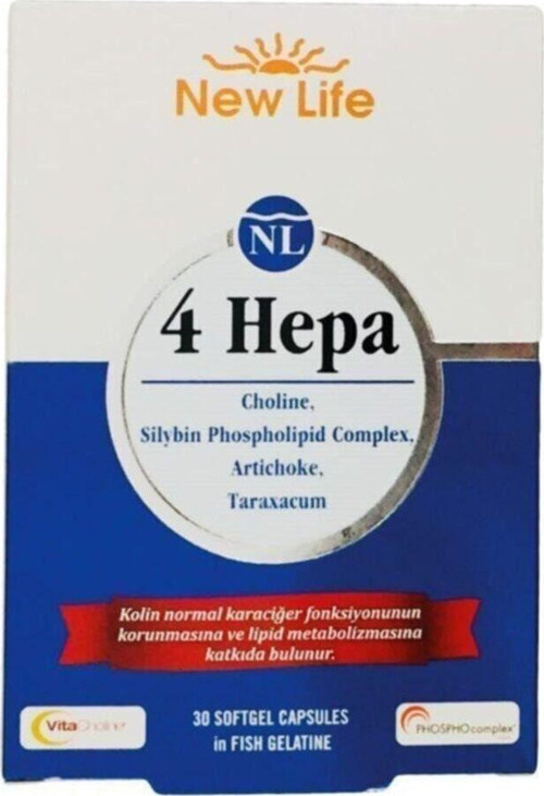 New Life 4 Hepa karaciğer fonksiyonlarının korunmasına yardımcı olur. Bu üründe Milk thistle bitkisinin esas etkin maddesi olan silibin kullanılmıştır. Ayrıca silibin-fosfolipid kompleksinin, standart milk thistle (devedikeni) ürünlerine göre biyoyararlanımı 3,5 kat daha fazladır. Kolin, normal karaciğer fonksiyonunun korunmasına ve lipid metabolizmasına katkıda bulunur. Günde 1 kapsül kullanılması önerilmektedir.