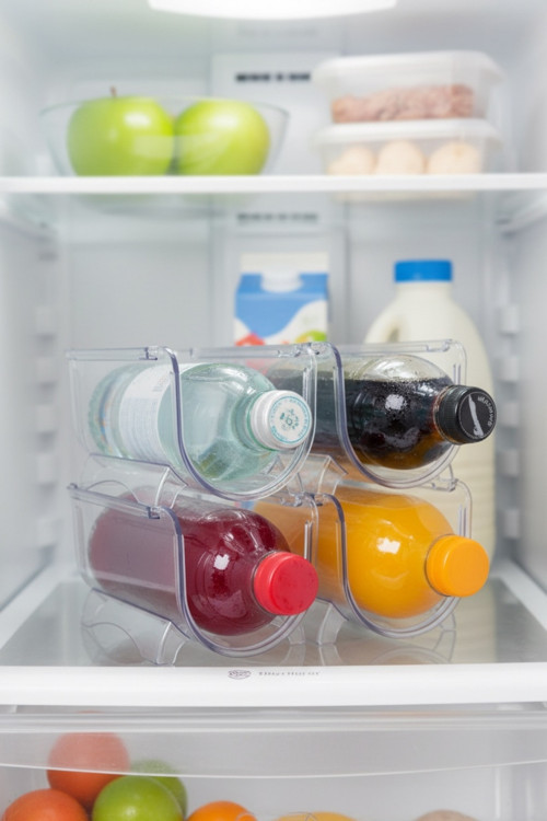 Bu 4 Parça Şeffaf Buzdolabı Şişe Düzenleyici Seti ile buzdolabınızın içindeki dağınıklığa son verin! Yatay istifleme özelliği sayesinde, dolabınızdaki boş alanları en verimli şekilde kullanmanızı sağlar ve şişelerinizin sabit durmasını garantiler.