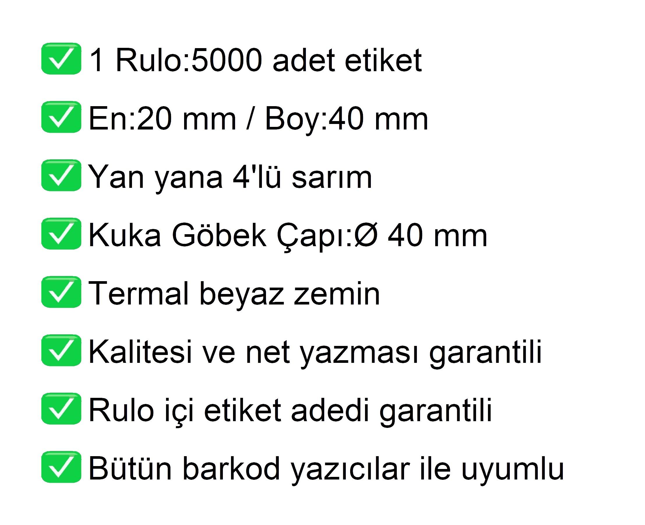 40x20 mm Termal ürün Barkod Etiketinin özellikleri ve açıklamaları aşağıda verilmiştir. Farklı ölçü seçenekleri ve daha fazla bilgi için mağazamızı ziyaret edebilirsiniz.