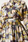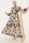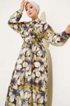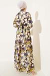4932 Bel Lastikli Düğmeli Çiçek Desen Elbise - Yağ Yeşili