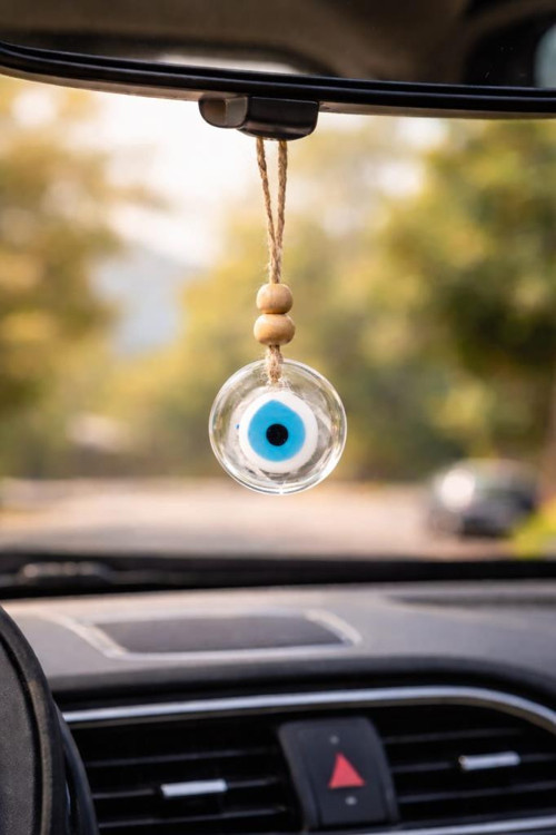 5 Cm Şeffaf Cam Nazar Boncuğu – Ağaç, Araba Dikiz Aynası ve Kapı Süsü – İpli Doğal Ahşap Boncuklu Nazarlık