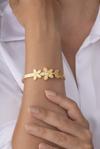 Zarif tasarımıyla ön plana çıkan bu altın kaplama çelik kelepçe bileklik, 5 yapraklı yonca detayıyla şıklığı ve anlamı bir araya getiriyor. 5 yapraklı yonca, nadir rastlanan bir sembol olduğu için bolluk, bereket, şans ve olumlu enerjiyi temsil eder. Hem günlük kombinlerinizde hem de özel davetlerde stilinizi tamamlayan bu bileklik, dayanıklı yapısı sayesinde uzun yıllar kullanılabilir. Kendinize şans katmak veya sevdiklerinize özel bir anlam yükleyen hediye sunmak için ideal bir seçimdir.
