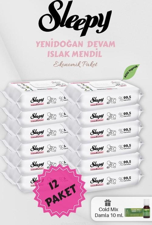 50' li Yenidoğan Islak Mendil 12 Paket, Yeşil Cold Mix Hediyeli,