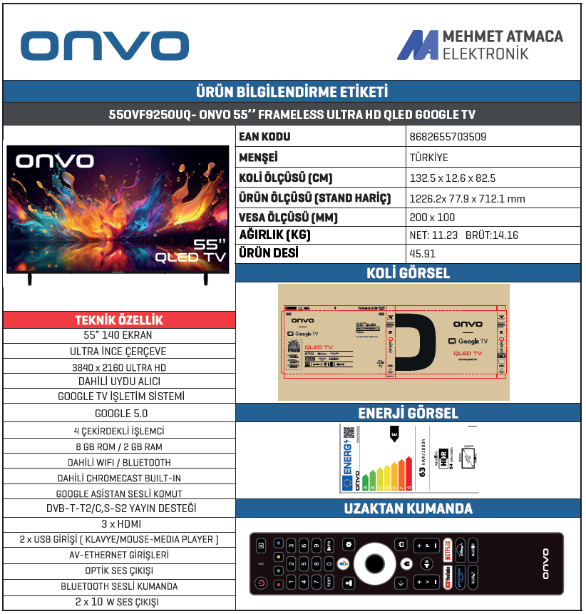 55OVF9250UQ / ONVO 55'' ULTRA HD QLED GOOGLE TV