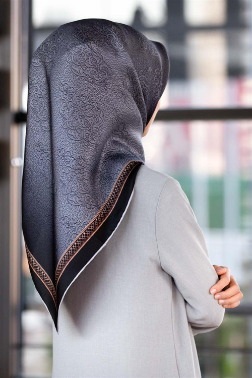 % 57 İPEK % 43 VİSKON Twill Barok Desenli Gümüş Renkli 90x90 Eşarp Dikim Şekli: El Dikişi