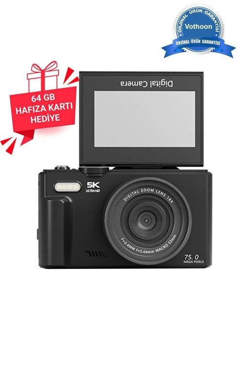 Vothoon 5K 75MP 18X Zoom Flaşlı 3” Flip Ekranlı Türkçe 64GB Kart Dijital Vlog Fotoğraf Makinesi