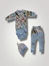 6-9 12-18 18-24 Ay Power Kedi Nakışlı Uzun Kollu Zıbınlı Şapkalı 3lü Kız Erkek Bebek Takımı Mavi