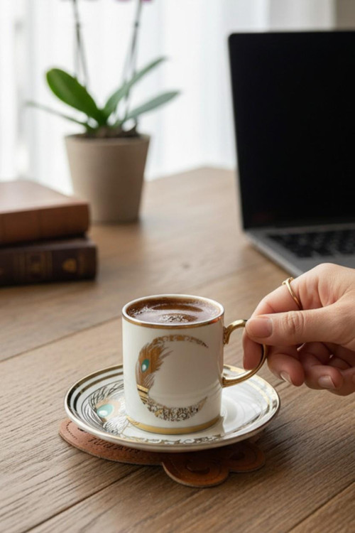 Tavus kuşunun görkemli tüylerinden ve mistik enerjisinden ilham alınarak tasarlanan bu özel set, kahve saatlerinizi bir sanat ritüeline dönüştürüyor. Beyaz porselenin saflığı, altın rengi kulp ve detaylarla birleşerek masanıza saray şıklığı getiriyor.