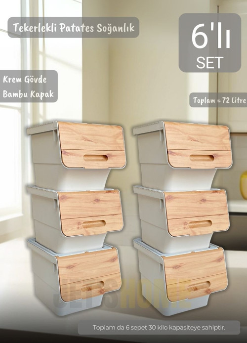 Jet' s Home 6’lı Bambu Renk Tekerlekli Patateslik Soğanlık Oyuncak Kutusu Patates Soğan Sepeti Toplam 72 Lt