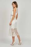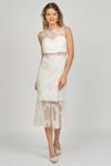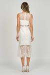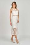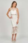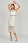 Detay: Dar kalıp, gloplu, midi boy, kolsuz, yuvarlak yaka, dantel kumaş, çizgili, dekoltesiz, astarlı abiye elbise;