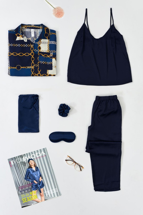 For You İn&Out 6'lı Hem İçeride Hem Dışarıda Zincir Desen Lacivert Pijama Takım markamızın çok şık ve hem içerde giyim hem de dışarda giyebilmeniz için tasarlanan ve 6 parçadan oluşan harika takım ile evde ve dışarıda geçireceğiniz günlerde size eşlik edecek, satenin muhteşem yumuşacık dokusuyla teninizde çok rahat bir hisle giyebileceğiniz bu setimiz iç büstiyeri, uyku gözlüğü çantası tokası, siyah şerit ile süslenmiş uzun bir alt pantolonu ve şık bir gömleğin birlikteliğinde oluşuyor.