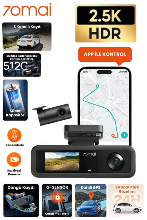 2.5K (2560×1440) HDR çözünürlükte ön kamera, iç ve arka kameralarla 3 kanallı kayıt sistemi