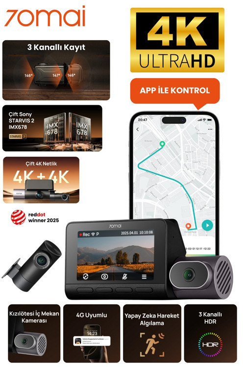 Ön ve arka 4K, iç kamera 1080p olmak üzere 3 kanallı kayıt sistemi