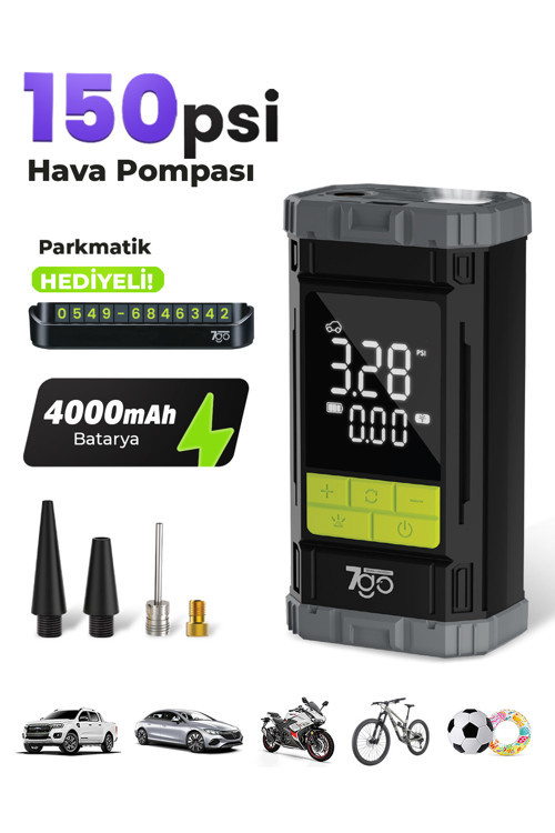 7Go 7A6 Turbo Boost Şarjlı Hava Pompası – 150 PSI Taşınabilir Lastik Şişirme Kompresörü 4000mAh Powerban