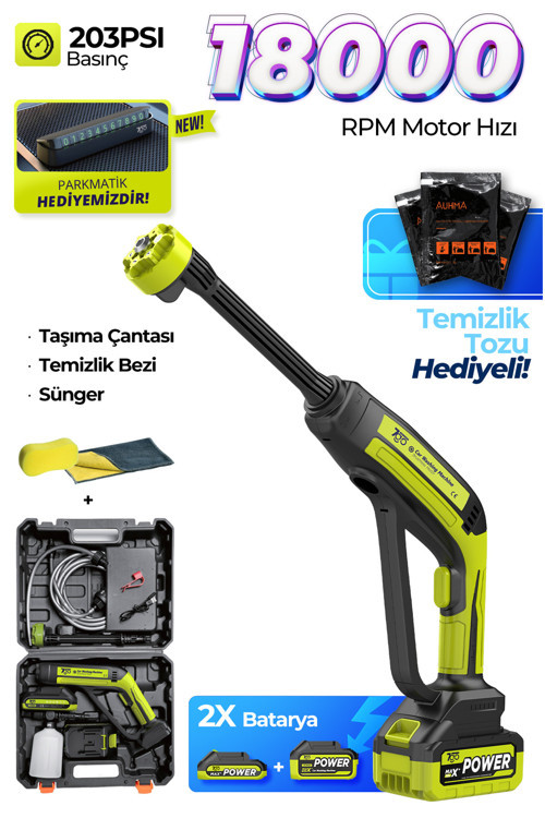 7CW02 Akülü Şarjlı Yüksek Basınçlı Araç ve Bahçe Yıkama Temizleme Tabancası | 2 Batarya, 5m Hort