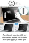 Temizlik seti, ekran temizliği için kullanılabilen yeniden doldurulabilir mini sprey şişesiyle birlikte gelir. Sprey sonrası kullanılan köpük başlık, hem temizlik sağlar hem de ekranı kurutarak leke bırakmaz. Kimyasal içermeyen temizleyicilerle birlikte kullanıldığında ekran parlaklığını korur.
