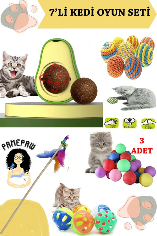 Pamepaw 7Li Set : Yapışkanlı Kedi Çimi Avokado Catnip , Sarma Top , Olta , 3Lü Mini Top , Çıngıraklı Top