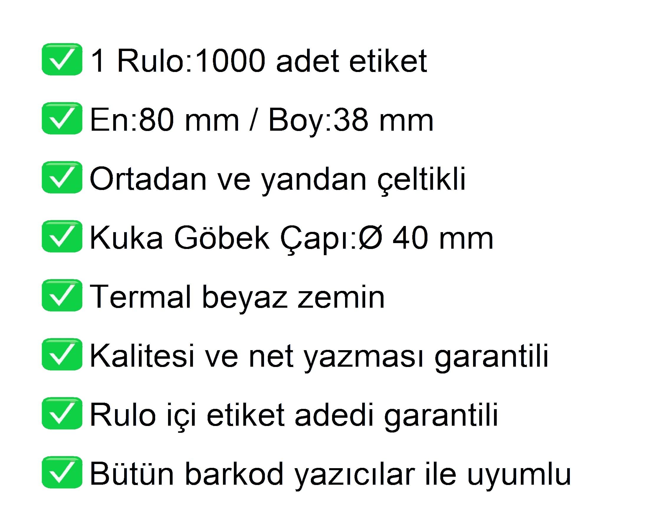 80x38 mm Karton Termal Raf Etiketinin özellikleri ve açıklamaları aşağıda verilmiştir. Farklı ölçü seçenekleri ve daha fazla bilgi için mağazamızı ziyaret edebilirsiniz.