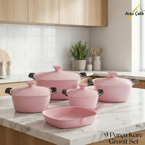 9 Parça Kare Granit Set (Pembe), kare formdaki derin tencereleri ve ızgara tavası ile hem günlük yemeklerde hem de kalabalık sofralarda geniş ve pratik bir kullanım sunar. Dayanıklı granit kaplama yapısı sayesinde yanmaz–yapışmaz yüzeye sahiptir; yemeklerin dibe tutmasını önlemeye yardımcı olur ve kolay temizlik sağlar. PFOA içermez yapısıyla sağlıklı ve güvenli pişirme imkânı sunar.