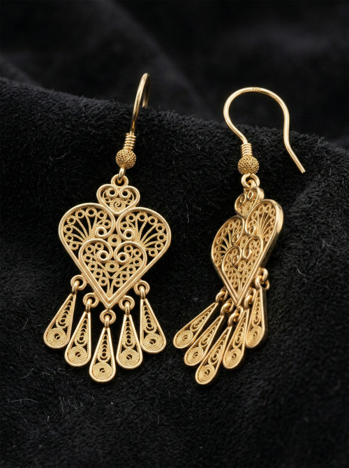 Roza Silver 925 Ayar Gümüş Altın Kaplama Geleneksel Telkari Kalp Küpe - Damla Püskül Sallantılı El İşçiliği