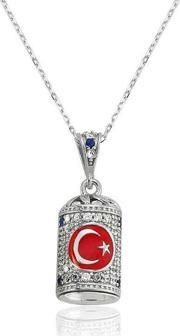 Türk Bayrağının rengini şehitlerin kanından, ilhamını da kan gölüne yansıyan ay ve yıldızdan aldığını biliyoruz. Bayrağın taşıdığı kutsal anlam ve cevşenin taşıdığı dini bir anlamın bir arada kullanıldığı bu gümüş kolyeyi boynunuzda taşımaktan ve sevdiklerinizle paylaşmaktan mutluluk duyacaksınız. 925 ayar gümüşten imal edilmiştir. Gümüş üzerine rodyum kaplama yapılmıştır. Rodyum kaplama yapılan gümüş cevşenler parlaklığını uzun süre muhafaza eder, oksitlenmesi gecikir. Üzerinde bulunan taşlar zirkondur. Zincir boyu ortalama 45 cm'dir. Ürünlerimizin tamamı el emeği ile üretilmiştir. Gümüş ve değerli taşlar nedeniyle belirtilen ortalama ürün ağırlığında ± %10 sapma olabilmektedir.