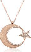Türk bayrağının ilhamını da kan gölüne yansıyan ay ve yıldızdan aldığını biliyoruz. Bayrağın taşıdığı kutsal anlamı boynunuzda taşımak ve sevdiklerinizle paylaşmak için kaçırılmayacak bir fırsat sunuyoruz. 925 ayar gümüşten imal edilmiş olan bu ay yıldız kolye modeli üzerindeki beyaz taşlar zirkondur. Gümüş üzerine rose kaplama yapılmıştır. Rose kaplama yapılan tüm gümüş bayan kolye modelleri parlaklığını uzun süre muhafaza eder. 45 cm uzunluğunda gümüş zinciri vardır. Tüm gümüş kolye modellerimizde olduğu gibi gümüş ay yıldız kolye modeli de el emeği ile üretilmiştir. Gümüş ve değerli taşlar nedeniyle belirtilen ortalama ürün ağırlığında ± %10 sapma olabilmektedir.