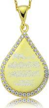 Nazar bakış demektir ve her canlıya nazar değebilmektedir. Bu nazar hastalığından korunmak, şifa bulmak için nazar duası okunur... Bu maneviyatı yüksek kolye; doğum günü hediyesi, sevgililer günü hediyesi veya annelere hediye olarak özel günlerde tercih edilebilecek mükemmel bir seçenektir. Kolye; 925 ayar gümüşten imal edilmiştir. Kolye üzerine altın kaplama yapılmıştır. Altın kaplama yapılan ürünler parlaklığını uzun süre muhafaza eder, gümüşü sarı renge dönüştürür ve oksitlenmeyi geciktirir. Kolye üzerinde bulunan taşlar zirkondur. Tüm gümüş kolyelerde olduğu gibi gümüş taşlı nazar duası kolye modeli de el emeği ile üretilmiştir. Gümüş ve değerli taşlar nedeniyle belirtilen ortalama ürün ağırlığında ± %10 sapma olabilmektedir.