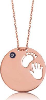 Masumiyeti ve saflığı simgeleyen el ve ayak izi kolye hayatta en değerli varlığınız olan anneniz için en anlamlı hediyelerden biri olacaktır. El ayak izi anne kolye 925 ayar gümüşten imal edilmiştir. Gümüş üzerine rose kaplama yapılmıştır. Rose kaplama yapılan gümüş kolye modelleri parlaklığını uzun süre muhafaza eder. İstenildiği takdirde kolye üzerinde isim ve tarih yazılabilir. Kolye üzerindeki nazar boncuğu soğuk mine yöntemiyle yapılmıştır. Gümüş olan zincir boyu ortalama 45 cm'dir. Gümüş el ayak izi anne kolye modeli diğer tüm gümüş kolye modellerinde olduğu gibi el emeği ile üretilmiştir. Gümüş ve değerli taşlar nedeniyle belirtilen ürün ağırlığında ± %10 sapma olabilmektedir.