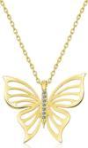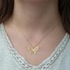 Kelebek; kadınlarca tercih edilen en popüler motiflerden biridir. Sevenlerine doğanın gizemini ve insan hayal gücünün zenginliğini hatırlatır. Özgürlüğü masumiyeti ve saflığı simgeleyen bahar kelebeği, tertemiz sevginin ve aşkın ifadesidir. Sizin olduğu kadar sevdiklerinizin de keyifle takacağı bahar kelebeği kolye, sevdiğinize en güzel hediyelerden biri olacaktır. Kolye 925 ayar gümüşten imal edilmiştir. Gümüş üzerine altın kaplama yapılmıştır. Altın kaplama yapılan gümüş kolyeler parlaklığını uzun süre muhafaza eder ve oksitlenmesini geciktirir. Gümüş olan zincir boyu ortalama 45 cm'dir. Tüm gümüş kolyelerde olduğu gibi gümüş gold kelebek kolye modeli de el emeği ile üretilmiştir. Gümüş ve değerli taşlar nedeniyle belirtilen ortalama ürün ağırlığında ± %10 sapma olabilmektedir.