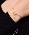 Maden : 925 Ayar Gümüş. Kaplama: Altın. Bileklik Zincir Uzunluğu: 18 cm. Taş: Zirkon. Figür En*Boy: 1 cm. Düğüm Uzunluğu:3,5 cm. Ürün Ağırlığı : 3,04 Gr ( +-). Gümüş ve değerli taşlar nedeniyle belirtilen ortalama ürün ağırlığında ± %5 sapma olabilmektedir. Teslimat: Ürün ahşap hediye kutusunda gönderilecektir. Kullanım: Parfüm, dezenfektan, çamaşır suyu gibi kimyasallardan uzak tutunuz.
