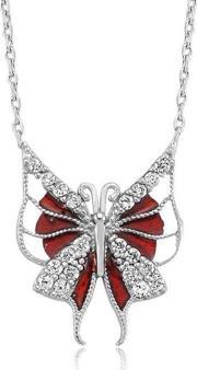Kelebek tertemiz sevginin, saflığın ve aşkın ifadesidir. Minicik bir tırtılken kendi ördükleri kozanın içerisine girip sabırla bekledikten sonra bambaşka bir görünüm ve güzellik ile kelebeğe dönüşüm yaşanması renkli kelebek kolye modelleri için de ilham kaynağı olmuştur. Renkli kelebek kolye aşkın küçük bir kıvılcım ile başladığı daha sonra büyük bir sabır ile büyüdüğü ve en sonunda kozasından çıkarak ilan-ı aşk edilmesidir. Sizin olduğu kadar sevdiklerinizin de keyifle takacağı gümüş kırmızı kelebek kolye modeli sevgiliye en güzel hediyelerden biri olacaktır. Kırmızı kelebek kolye modeli 925 ayar gümüşten imal edilmiştir. Gümüş üzerine rodyum kaplama yapılmıştır. Rodyum kaplama yapılan gümüş kolye modelleri parlaklığını uzun süre muhafaza eder ve oksitlenmesi gecikir. Kolye üzerinde bulunan tüm taşlar zirkondur. Gümüş olan zincir boyu ortalama 45 cm'dir. Bu kırmızı kelebek kolye de diğer gümüş kolye modelleri gibi el emeği ile üretilmiştir. Gümüş ve değerli taşlar nedeniyle belirtilen ortalama ürün ağırlığında ± %10 sapma olabilmektedir.