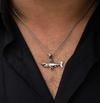 Köpek balıkları özellikle yırtıcı ve korkutucu simgeler olarak anlamlandırılır. Denizlerin kralı olan köpek balıkları zekayı ve özgürlüğü temsil eder. Sevdikleriniz için özgürlüğün sembolü olan köpek balığı kolye ile anlam dolu bir hediye vermeye ne dersiniz? Özel tasarım köpek balığı kolye boynunuzdan çıkarmak istemeyeceğiniz kolyelerden biri olacaktır. 925 ayar gümüşten imal edilmiş bu özel tasarım kolyeyi sevdiğiniz ve değer verdiğiniz kişilere hediye edebilirsiniz. Gümüş köpek balığı kolye üzerine oksit kaplama yapılmıştır. Oksit kaplama yapılan gümüş kolye modelleri parlaklığını uzun süre muhafaza eder. Tüm gümüş kolye modellerinin tamamında olduğu gibi gümüş köpek balığı kolye modeli de el emeği ile üretilmiştir. Gümüş ve değerli taşlar nedeniyle belirtilen ortalama ürün ağırlığında ± %10 sapma olabilmektedir.
