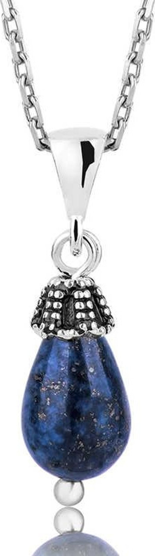 Kireç taşının diğer bazı minerallerle birleşerek değişime uğraması sonucu oluşmuş bir taştır. Rengi kendine has mavi, morumsu mavi ve yeşilimsi mavidir. Kendisi mat, çizgileri ise aydınlık ışıltılı mavidir. Opak veya yarı saydam olabilir. Üzerinde altın sarısı ve beyazımsı bölgeler bulunmaktadır. Bu şekliyle çok albenili bir taştır. Lapis Lazuli beğenilen bir taş olduğundan, bol miktarda sahtesi vardır. Gerçek Lapis Lazulis de az miktarda da olsa altın sarısı ve beyazımsı lekeler bulunur. Tamamen aynı renkte olanlar büyük ihtimalle sahte veya sentetiktir. Taşın üzerindeki altın sarısı veya beyazımsı lekeler mumlanarak da oluşturulabilir. Bu yüzden biraz sert bir cisimle sertliği ve boyalı olup olmadığı kontrol edilmelidir, aşırı koyu renkli veya parlak olanlarından uzak durulmalıdır. Bu lapis doğal taş kolye 925 ayar gümüşten imal edilmiştir. Gümüş üzerine oksit kaplama yapılmıştır. Oksit kaplama yapılan gümüş doğal taşlı kolye modelleri parlaklığını uzun süre muhafaza eder. Gümüş olan zincir boyu ortalama 45 cm'dir. Lapis doğal taş kolye el emeği ile üretilmiştir. Gümüş ve değerli taşlar nedeniyle ürün ağırlığında ± %10 sapma olabilmektedir.