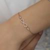 Gümüş zirkon taşlar ve sonsuzluk modelinin bir araya geldiği sevdiklerinize sevginizi gösterebileceğiniz şık ve anlamlı bir hediye olacaktır. Bu sonsuzluk model bileklik üzerine rose kaplama yapılmıştır. Rose kaplama yapılan gümüş kadın bileklik modelleri parlaklığını uzun süre muhafaza eder ve oksitlenmesi gecikir. Kadın bileklik modellerinin tamamında olduğu gibi gümüş sonsuzluk kadın bileklik modeli de el emeği ile üretilmiştir. Gümüş ve değerli taşlar nedeniyle belirtilen ortalama ürün ağırlığında ± %10 sapma olabilmektedir.