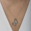 Kelebek; kadınlarca tercih edilen en popüler motiflerden biridir. Sevenlerine doğanın gizemini ve insan hayal gücünün zenginliğini hatırlatır. Özgürlüğü masumiyeti ve saflığı simgeleyen bahar kelebeği, tertemiz sevginin ve aşkın ifadesidir. Sizin olduğu kadar sevdiklerinizin de keyifle takacağı turkuaz taşlı kelebek kolye, sevdiğinize en güzel hediyelerden biri olacaktır. Kolye 925 ayar gümüşten imal edilmiştir. Gümüş üzerine rose kaplama yapılmıştır. Rose kaplama yapılan gümüş kadın kolyeler parlaklığını uzun süre muhafaza eder ve oksitlenmesini geciktirir. Gümüş olan zincir boyu ortalama 45 cm'dir. Tüm gümüş kadın kolyelerde olduğu gibi gümüş turkuaz taşlı kelebek kolye modeli de el emeği ile üretilmiştir. Gümüş ve değerli taşlar nedeniyle belirtilen ortalama ürün ağırlığında ± %10 sapma olabilmektedir.