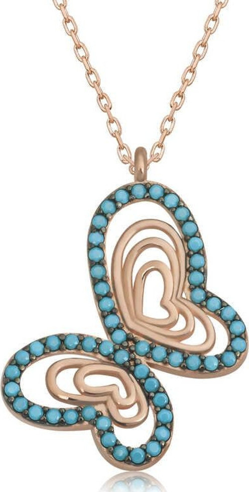 Kelebek; kadınlarca tercih edilen en popüler motiflerden biridir. Sevenlerine doğanın gizemini ve insan hayal gücünün zenginliğini hatırlatır. Özgürlüğü masumiyeti ve saflığı simgeleyen bahar kelebeği, tertemiz sevginin ve aşkın ifadesidir. Sizin olduğu kadar sevdiklerinizin de keyifle takacağı turkuaz taşlı kelebek kolye, sevdiğinize en güzel hediyelerden biri olacaktır. Kolye 925 ayar gümüşten imal edilmiştir. Gümüş üzerine rose kaplama yapılmıştır. Rose kaplama yapılan gümüş kadın kolyeler parlaklığını uzun süre muhafaza eder ve oksitlenmesini geciktirir. Gümüş olan zincir boyu ortalama 45 cm'dir. Tüm gümüş kadın kolyelerde olduğu gibi gümüş turkuaz taşlı kelebek kolye modeli de el emeği ile üretilmiştir. Gümüş ve değerli taşlar nedeniyle belirtilen ortalama ürün ağırlığında ± %10 sapma olabilmektedir.
