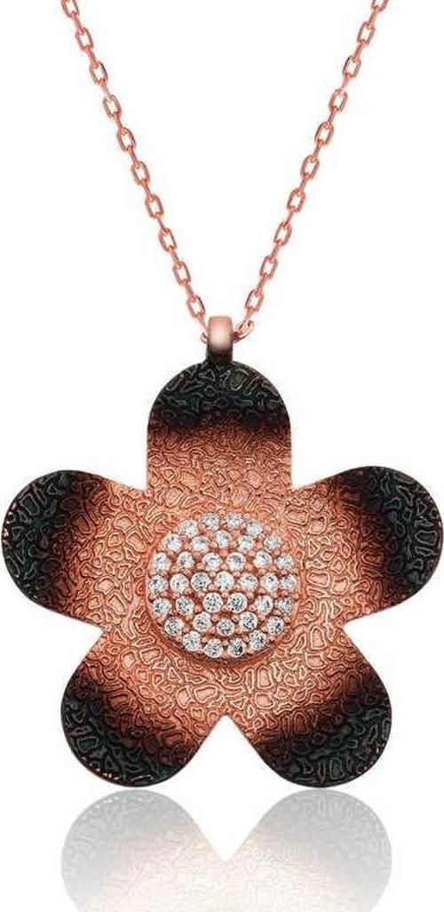 Sevdiklerinize duygularınızı ifade etmenin en özel ve zarif yolu O’na gönderebileceğiniz şık, rengarenk ve mis kokulu çiçeklerdir. Özel günlerde verilecek hediyeler arasında olan çiçek, bu kez gümüş kolye olarak tasarlandı... En kaliteli, en parlak, en ışıltılı taşlarla hazırlanmış gümüş çiçek  kolye sevgisini bir kez daha anlatmak isteyenleri, sen bir çiçeksin demek isteyenleri bekliyor. Bu özel tasarım çiçek  kolye 925 ayar gümüşten imal edilmiştir. Gümüş üzerine rose altın kaplama yapılmıştır. Rose altın kaplama yapılan gümüş  kolye modelleri parlaklığını uzun süre muhafaza eder, gümüşü pembe renge dönüşür, oksitlenmesi gecikir. Kolye üzerinde bulunan beyaz taşlar zirkondur. Tüm  gümüş kolyelerde olduğu gibi gümüş çiçek  kolye de el emeği ile üretilmiştir. Gümüş ve değerli taşlar nedeniyle belirtilen ortalama ürün ağırlığında ± %10 sapma olabilmektedir.