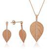 Yaprak deseni tabiattan almakta olduğu kuvveti, saygıyı ve zarafeti simgeler. Güçlüyüm, yeniden doğmayı bilirim imajı çizmektedir ve evrene olan saygıyı belirtmektedir. Gençlere ve kendisini genç hisseden tüm bayanlara özel; rose gümüş ve zirkon taşın ışıltısı ile yaşam enerjinizi etrafınıza yansıtın. Sizin olduğu kadar sevdiklerinizin de keyifle takacağı bu set modeli, sevginizin bir yaprak kadar huzur verici olduğunu ifade edebileceğiniz güzel hediyelerden biri olacaktır. Bu ikili set 925 ayar gümüşten imal edilmiştir. Gümüş üzerine rose altın kaplama yapılmıştır. Rose altın kaplama yapılan gümüş bayan set modelleri parlaklığını uzun süre muhafaza eder ve oksitlenmesi gecikir. Set üzerinde bulunan taşlar zirkondur. Kolyenin gümüş olan zincir boyu ortalama 45 cm'dir. Tüm gümüş bayan set modellerinde olduğu gibi bu gümüş yaprak ikili set modeli de el emeği ile üretilmiştir. Gümüş ve değerli taşlar nedeniyle belirtilen ortalama ürün ağırlığında ± %10 sapma olabilmektedir.