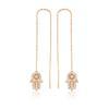 Her ne kadar Hz. Fatma'nın eli olarak bilinse de arapçada “hamse” diye anılır. Hamse, beş anlamına gelir ve bir elin parmak sayısını gösterir. Hz. Fatma bir gün mutfakta helva kavururken, eşi Hz. Ali görür ve pişen helvaya elini daldırır ancak hiçbir şey olmaz, helvayı böyle kavurmayı devam eder. O günden sonra elinin kutsallığına, gücüne adeta yenilmezliğine inanılır. Her güçlük adeta onun eliyle aşılacaktır. Bu eşsiz küpe; doğum günü hediyesi, sevgililer günü hediyesi veya annelere hediye olarak özel günlerde tercih edilebilecek mükemmel bir seçenektir. Bu harika tasarım Fatma eli bayan bayan küpe; 925 ayar gümüşten imal edilmiştir. Gümüş üzerine rose kaplama yapılmıştır. Rose altın kaplama yapılan tüm gümüş küpe modelleri parlaklığını uzun süre muhafaza eder, gümüşü pembe rengine çevirir, oksitlenmeyi geciktirir Küpe üzerinde bulunan beyaz taşlar zirkondur. Tüm gümüş bayan küpelerde olduğu gibi zincirli Fatma eli bayan küpe de el emeği ile üretilmiştir. Gümüş ve değerli taşlar nedeniyle belirtilen ürün ağırlığında ± %10 sapma olabilmektedir.