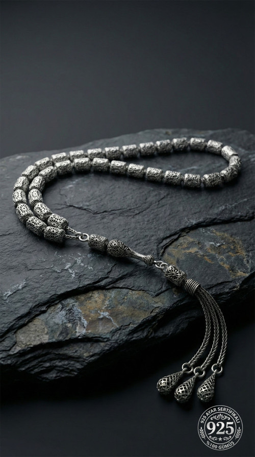 *Ürünün Tüm parçaları (Habbe, İmame, Püskül, Zincir ve tüm baglantı elemanları ile birlikte) 925 ayar sertifikalı gümüşten imal edilmiştir.