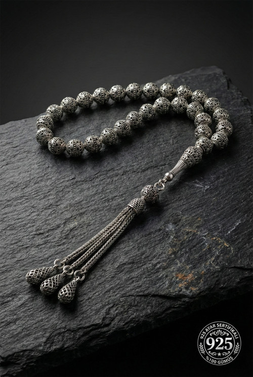 *Ürünün Tüm parçaları (Habbe, İmame, Püskül, Zincir ve tüm baglantı elemanları ile birlikte) 925 ayar sertifikalı gümüşten imal edilmiştir.